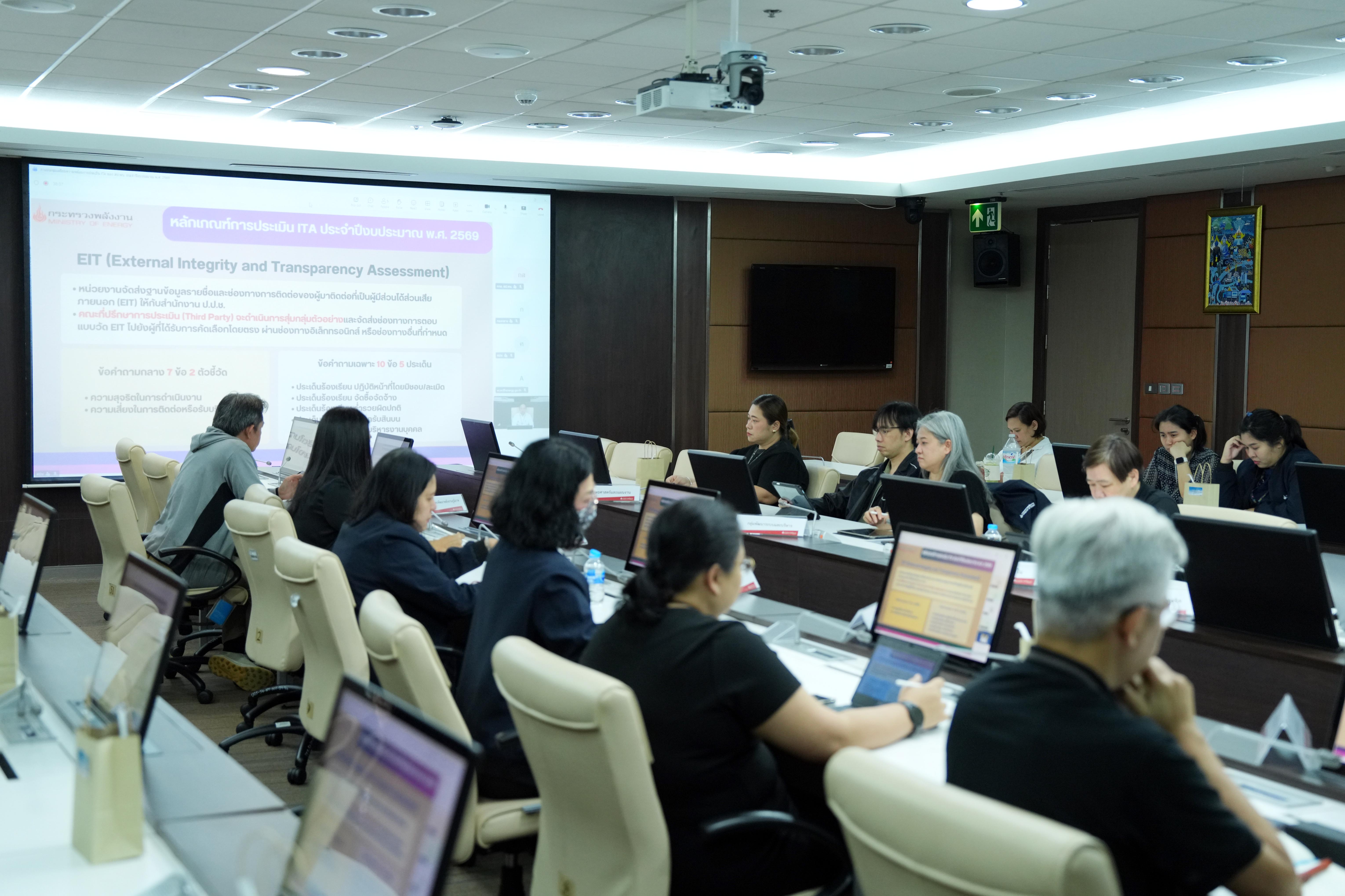วันที่ 18 มีนาคม 2569 ณ ห้องประชุม 1 ชั้น 15 อาคารบี ศูนย์เอนเนอร์ยี่คอมเพล็กซ์ ศูนย์ปฏิบัติการต่อต้านการทุจริต กระทรวงพลังงาน (ศปท.พน.) จัดประชุมเตรียมความพร้อมการประเมินคุณธรรมและความ โปร่งใสในการดำเนินงานของหน่วยงานภาครัฐ (Integrity and Transparency Assessment: ITA) ของสำนักงานปลัดกระทรวงพลังงาน (สป.พน.) ประจำปีงบประมาณ พ.ศ. 2569 โดยมีนายวีรพัฒน์ เกียรติเฟื่องฟู รองปลัดกระทรวงพลังงานเป็นประธานการประชุม พร้อมด้วยผู้อำนวยการและผู้แทนจากทุกหน่วยงานในสังกัดเข้าร่วมทั้งในรูปแบบออนไซต์และออนไลน์