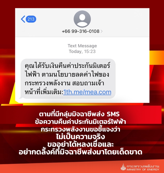 ตามที่มีกลุ่มมิจฉาชีพ ส่ง SMS ข้อความ คืนค่าประกันมิเตอร์ไฟฟ้า